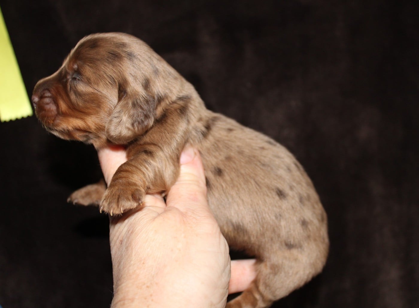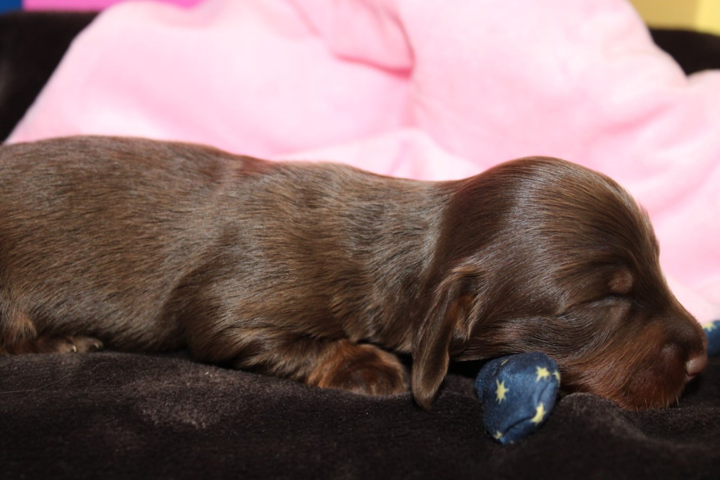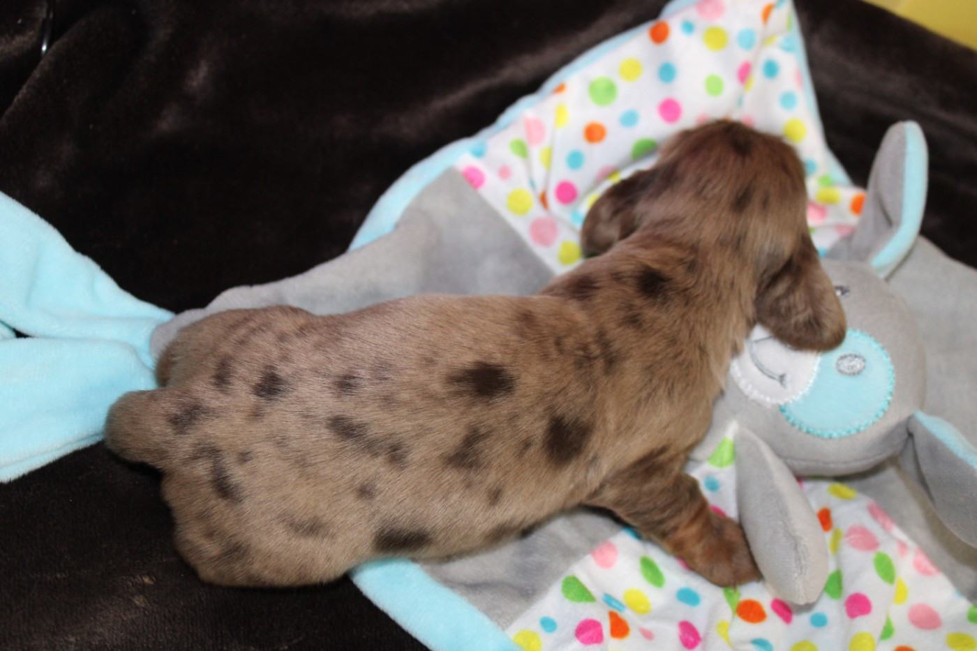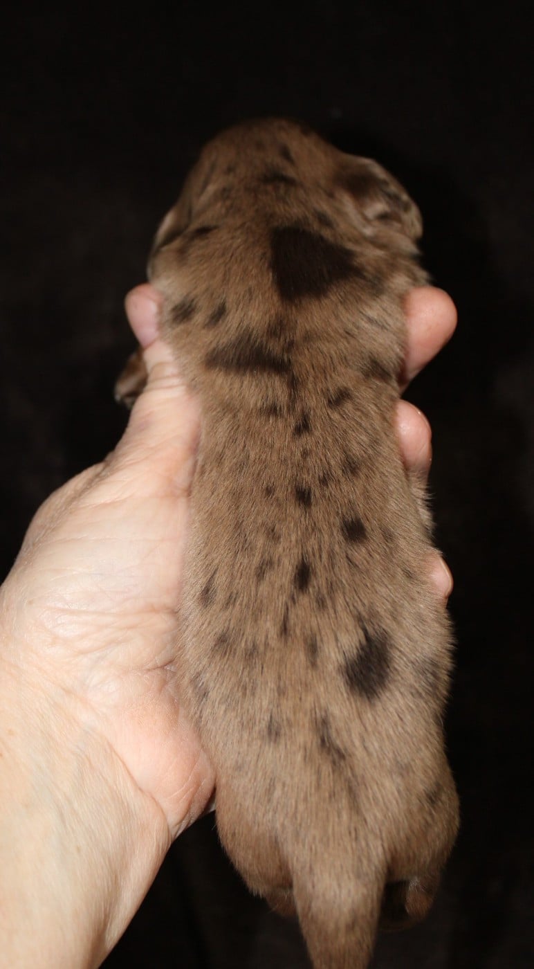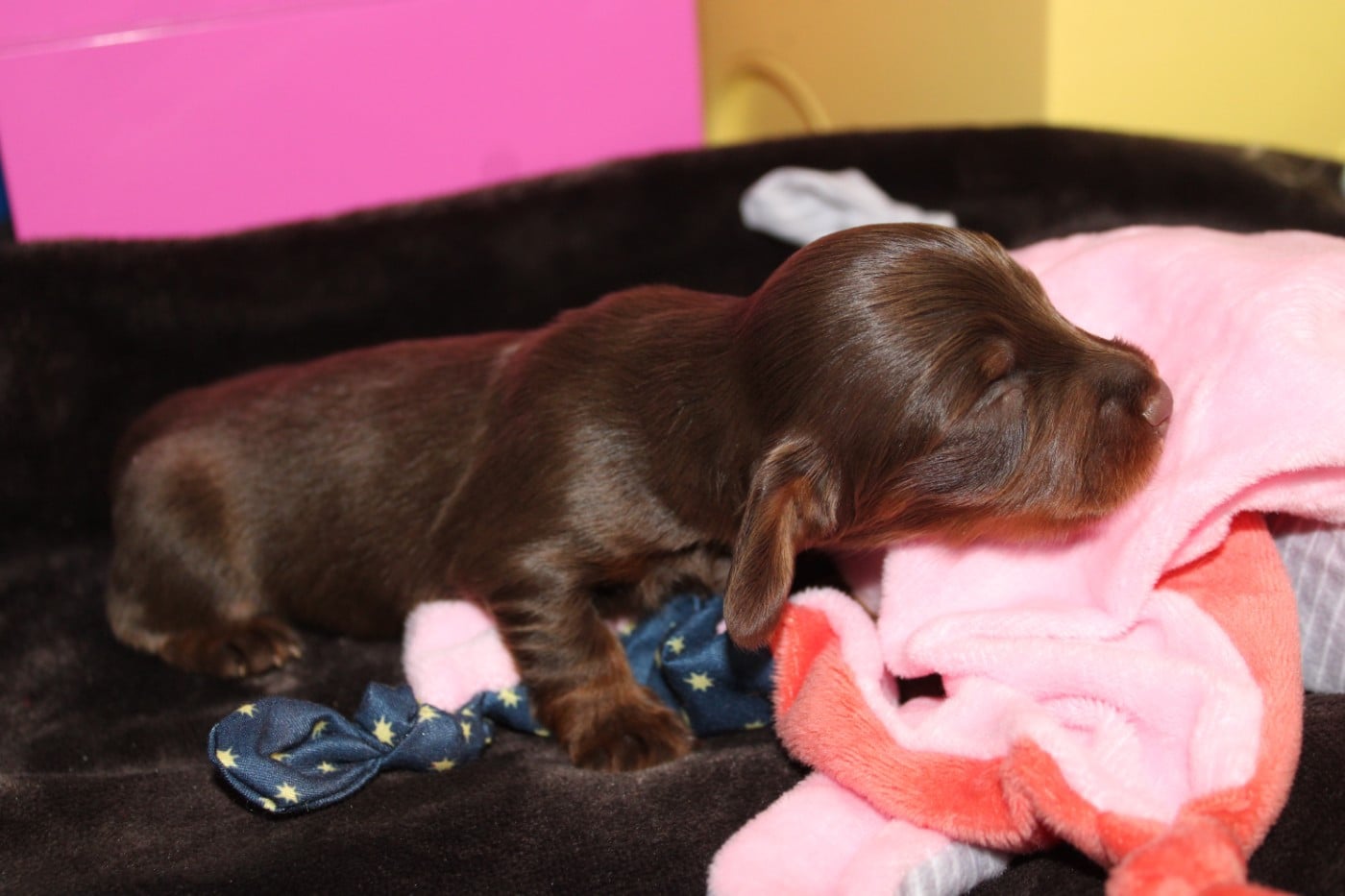 Bébé femelle chocolat et feu naine poils longs